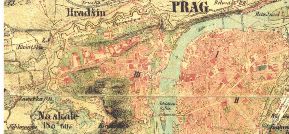 Praha na druhém vojenském mapování s výraznou fortifikací Malé Strany