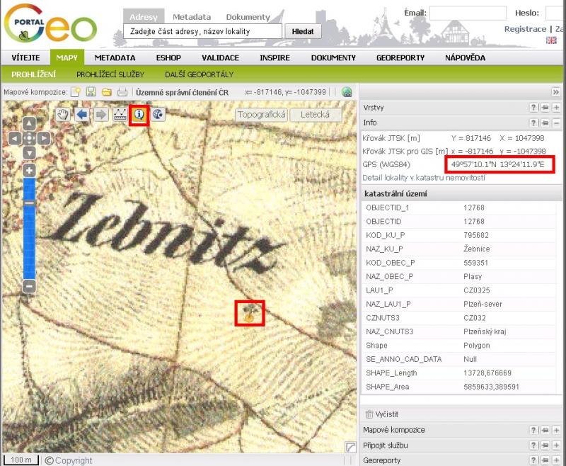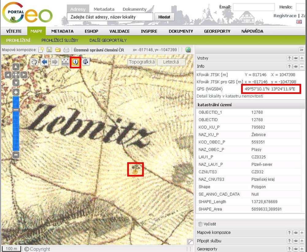 Zjištění souřadnice objektu na mapě II. vojenského mapování