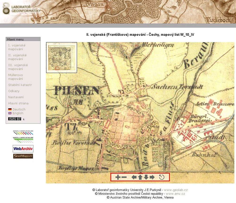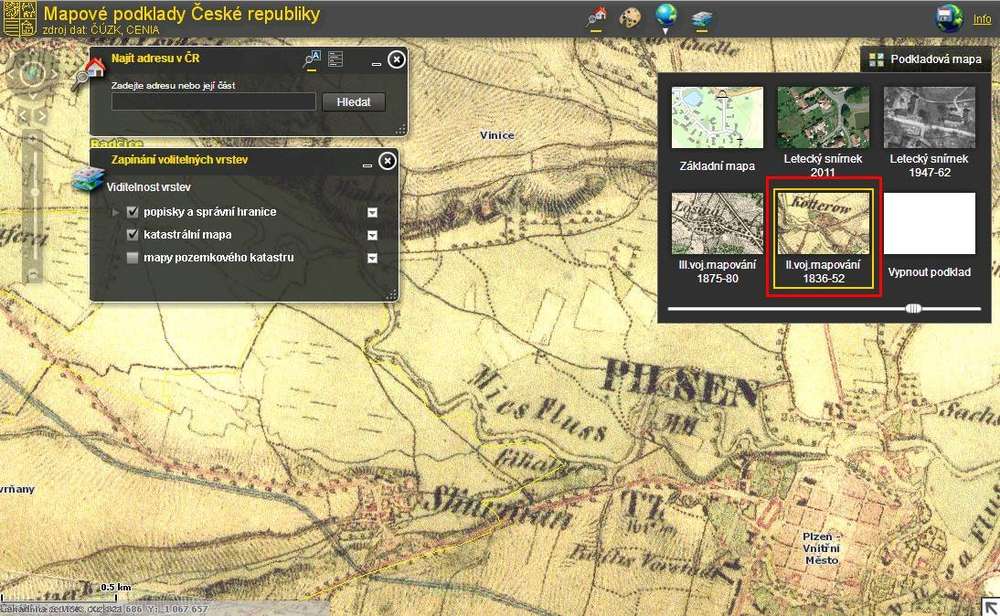 Vpravo zapněte "II. vojenské mapování" a vypněte ostatní vrstvy. Mapy jsou georeferencializovány (listy digitálně spojeny a umístěny na souřadnice).