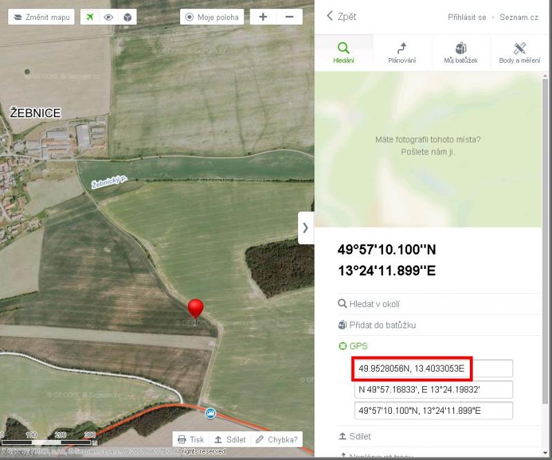 - Souřadnici můžete okopírovat a například vložit do hledání na Mapy.cz, které ji i převede na decimální tvar.