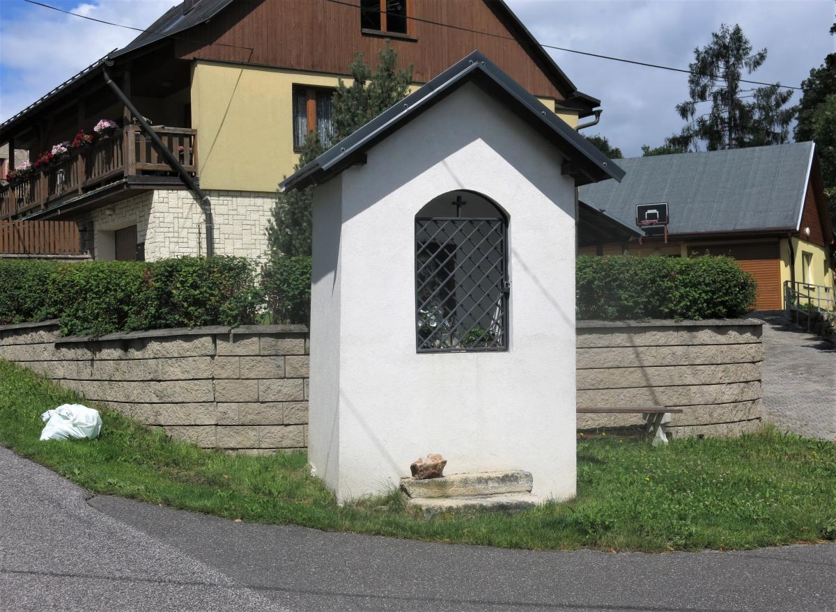 Krásná Kaple na rozcestí, poblíž penzionu. V r. 2016 vve velmi špatném stavu. Uvnitř jsou fragmenty barevné výmalby. Opravena po r.2017.