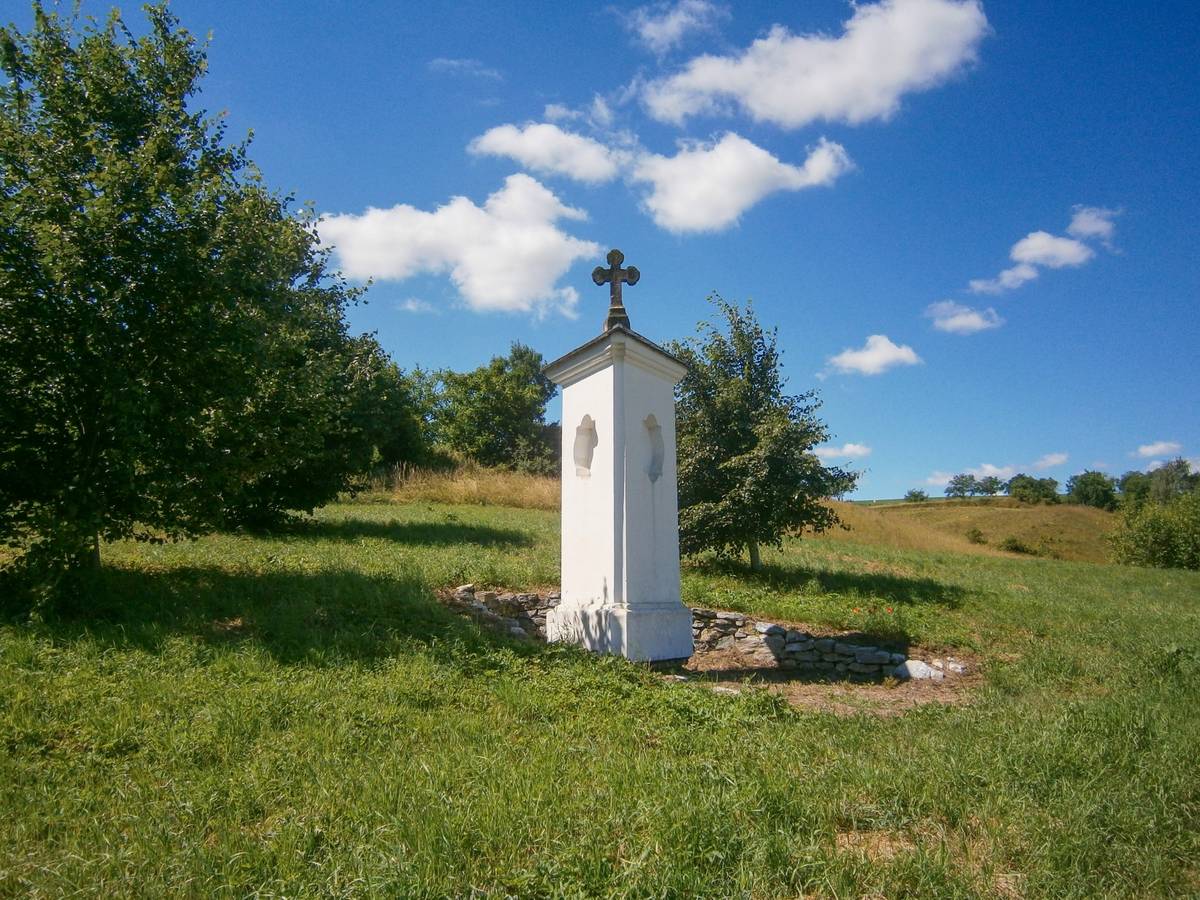 Sobáčov Trojboká boží muka u cesty z Mladče do Sobáčova. Na stříšce je kamenný kříž a Kristem, přední stranou otočený od cesty do stráně.