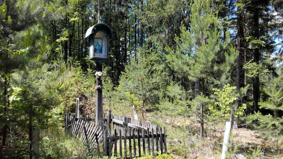 Kostelecké Horky Dřevěná vyřezávaná skříňka s kovovou stříškou a křížkem na vrcholu na dřevěném sloupku. Uvnitř je podobizna Ježíše Krista.