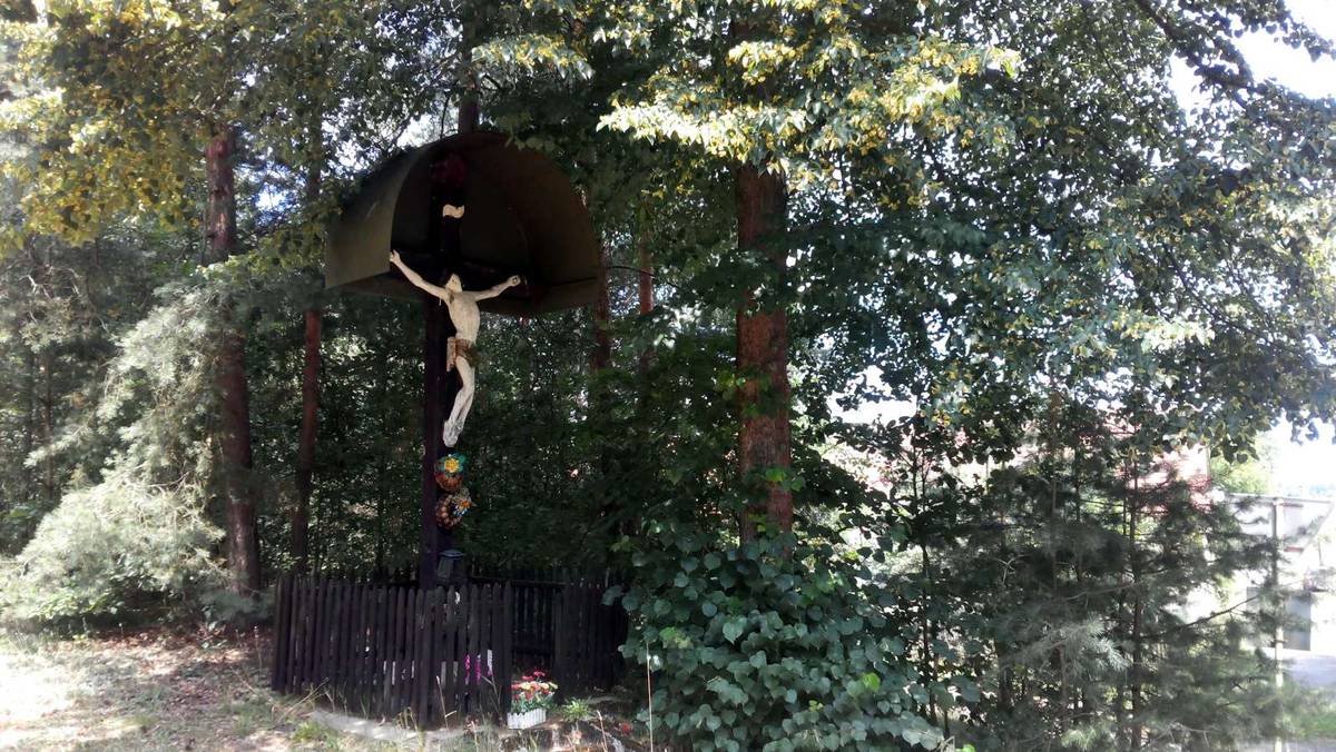 Malá Čermná nad Orlicí Dřevěný kříž s vyřezávanou dřevěnou sochou Krista.Horní ramena kříže kryje oblá plechová střecha.Okolo kříže je nízký plaňkový plot se zahrádkou.