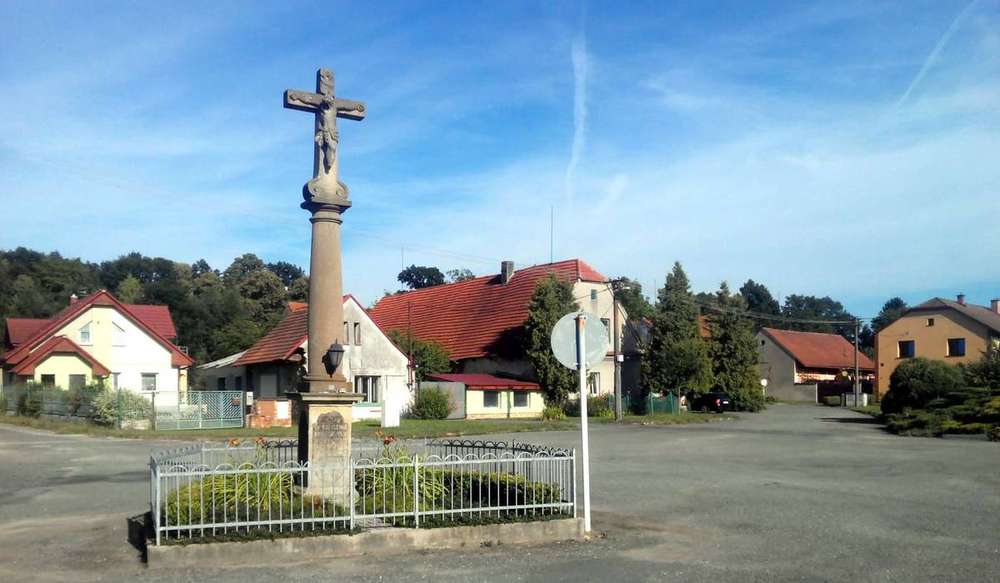 Skořenice Kamenný sloup s hlavicí a kamenným křížem v horní části.Na podstavci jsou na všech čtyřech stranách nápisy.
