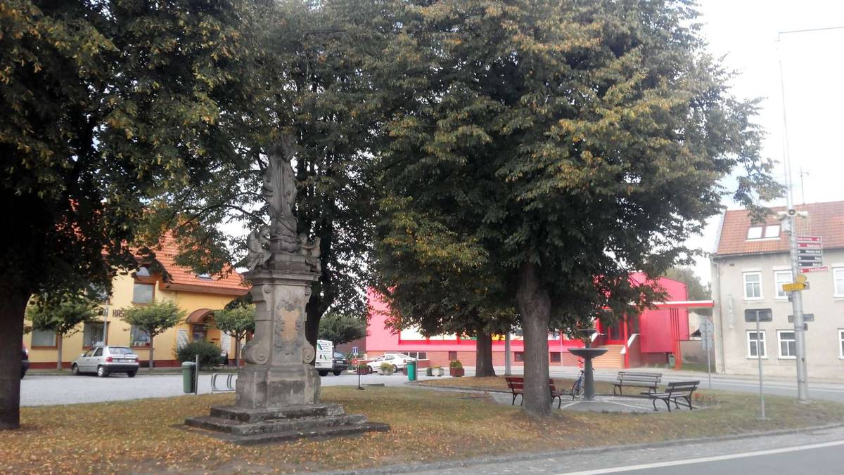 Borohrádek Socha Panny Marie stojící na zeměkouli s hadem.Po stranách sošky andělů s kartušemi.Na zadní straně je letopočet A 1761,obnoveno 1901.