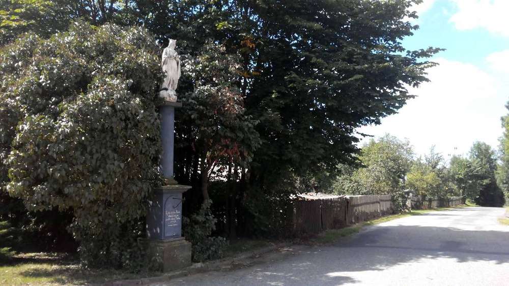 Polom u Potštejna Socha Panny Marie se sepjatýma rukama stojící na zeměkouli obtočené hadem. Na přední a zadní straně podstavce jsou nápisy.