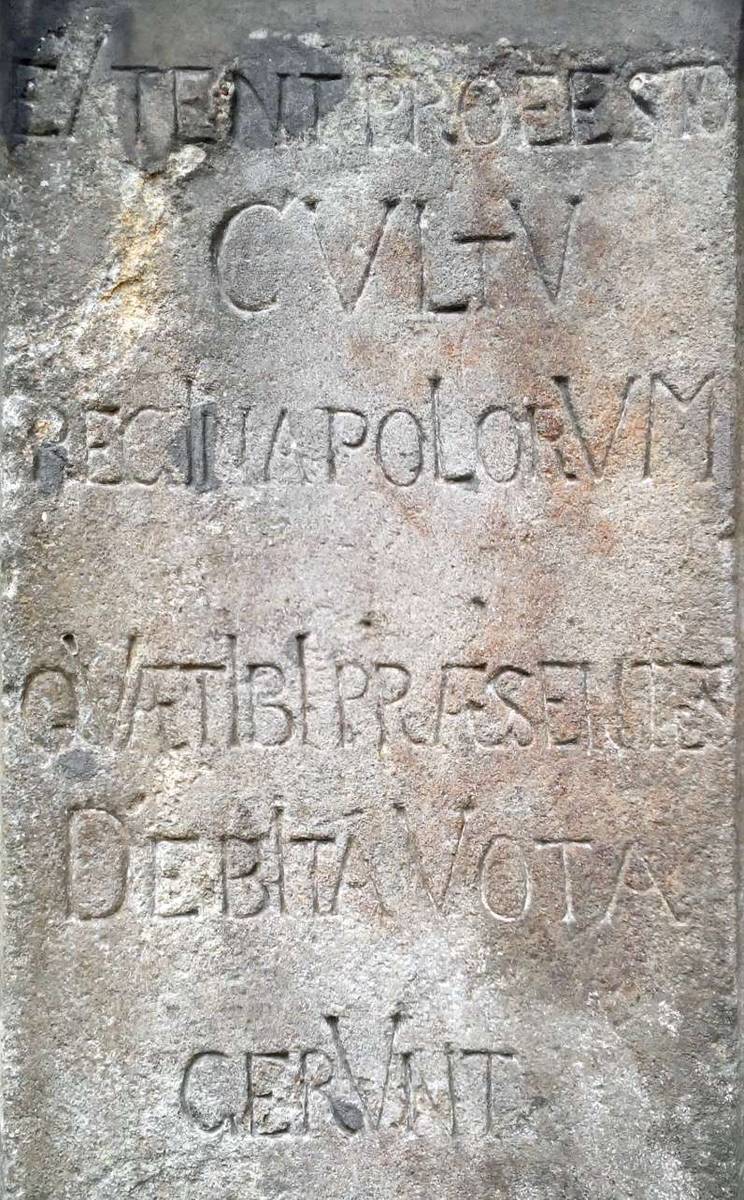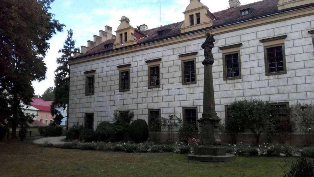 Častolovice Kamenná socha Panny Marie na kamenném trojbokém pilíři, na podstavci vepředu je reliéf dvou erbů, po stranách latinské nápisy.