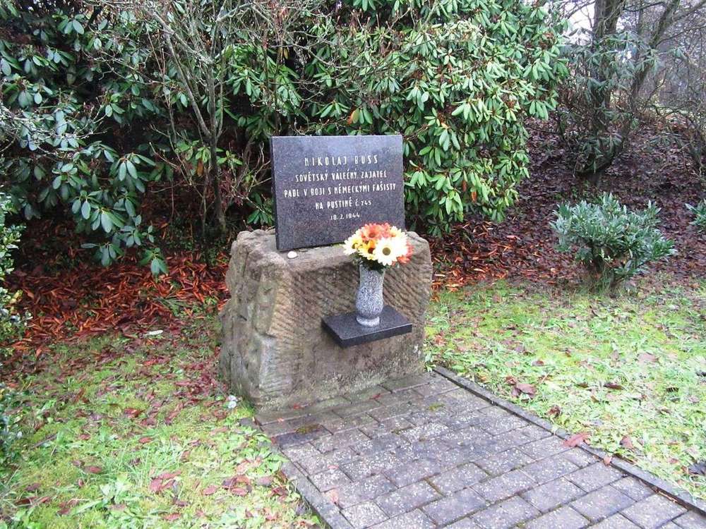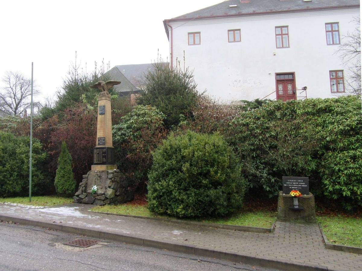 Jedlí Pomník padlým v první a druhé světové válce, vpravo pomník sovětského válečného zajetce.