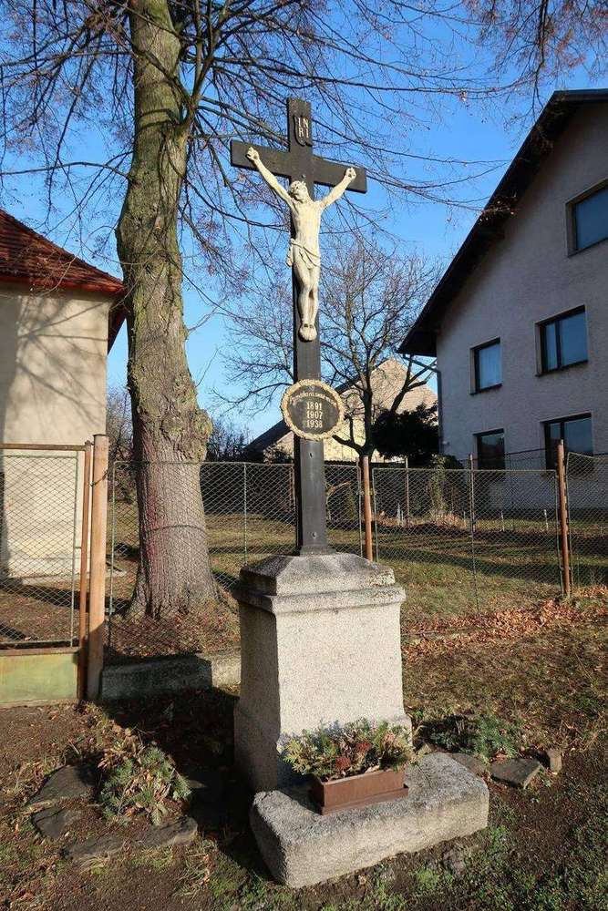 Obecnice Litinový kříž na kamenném podstavci vedle kostela sv. Šimona a Judy v Obecnici.