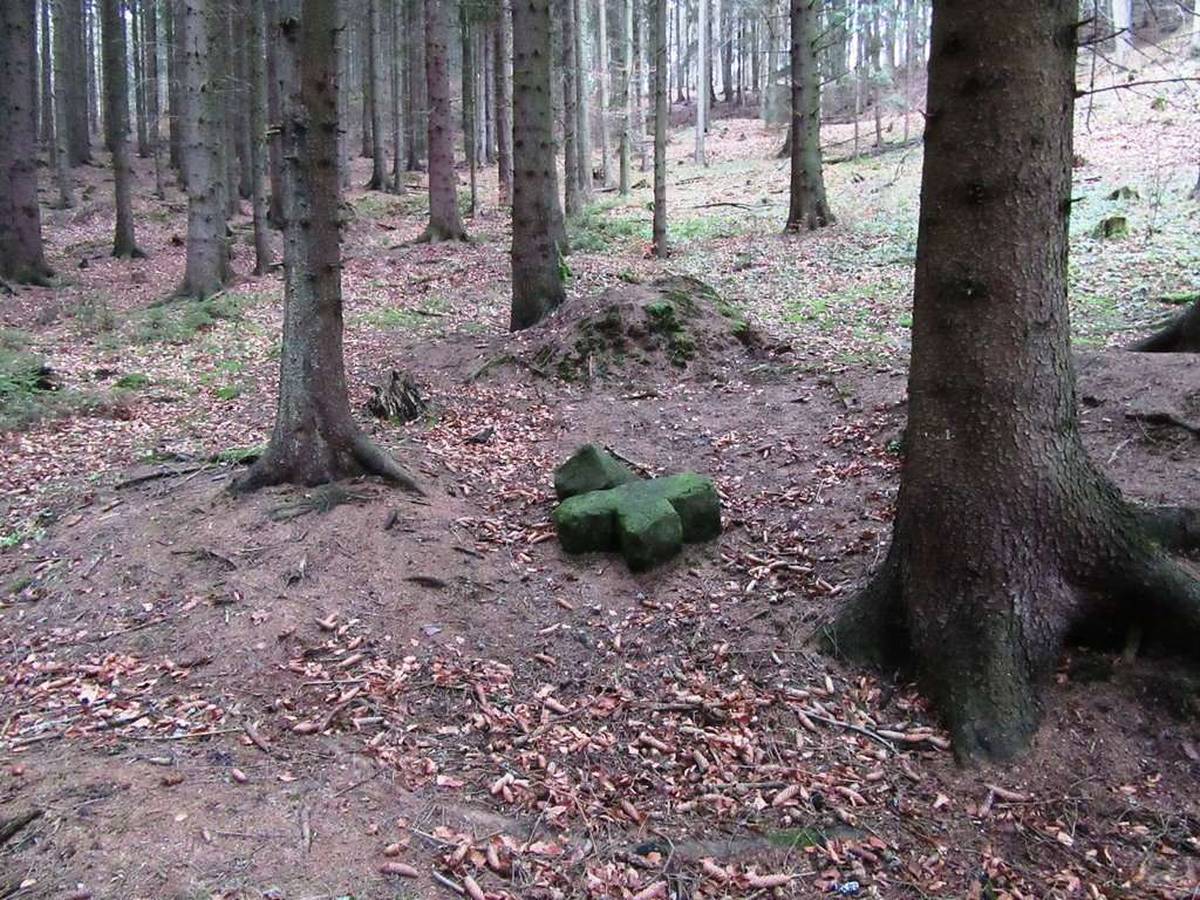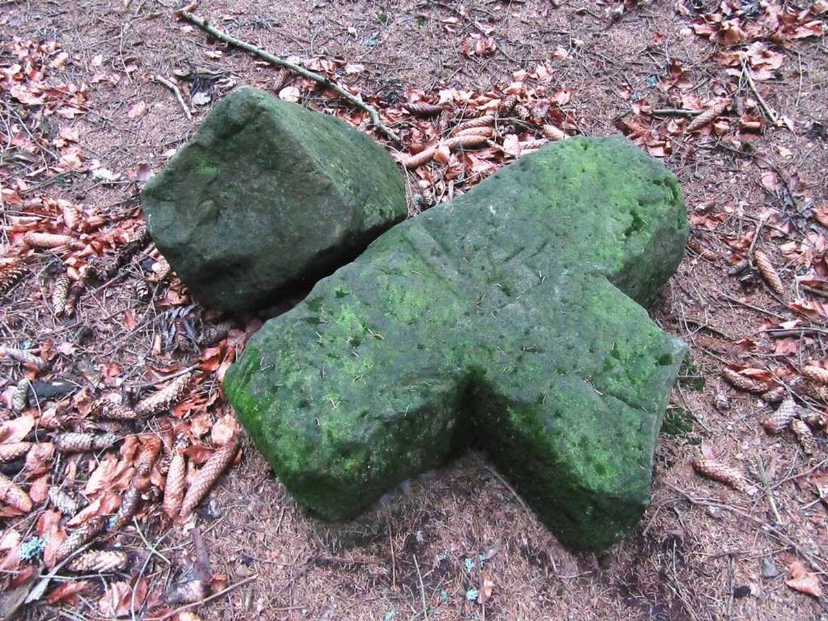 Svojanov Kříž je zlomený, leží vyvrácený na zemi. Dobře patrná rytina sekery. Dříve tudy vedla cesta.