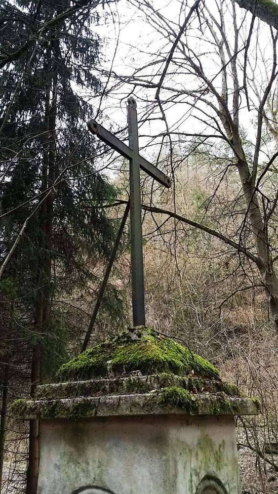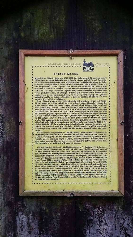 Železný křížek na pískovcovém podstavci se nachází v blízkosti obce Kokořínský důl u silnice v místě bývalého mlýna.