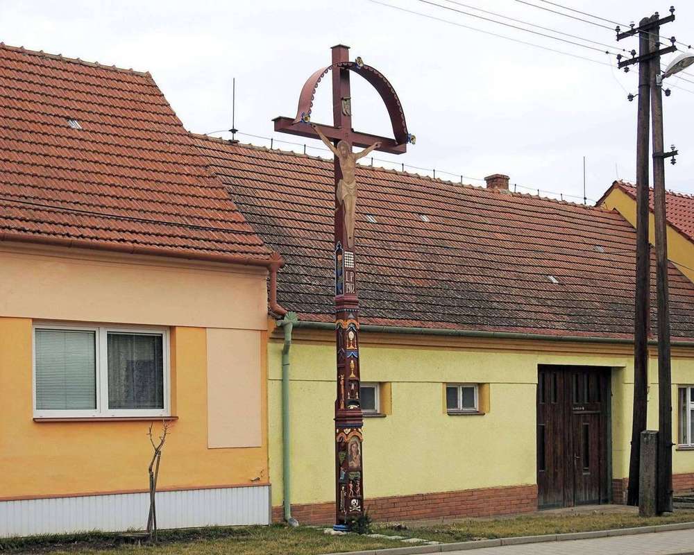 Kobylí Kříž vysvěcený roku 1905, který nechal postavit na obecním pozemku čtvrtláník Tomáš Lanžhotský, zhotovil a vyřezal stolařský mistr z Kobylí Říha a jsou na něm výjevy z umučení Páně.