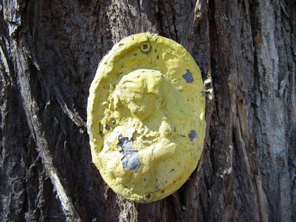 Komňátka Miniaturní obrázek Panny Marie. Přesněji: litinový odlitek natřený žlutou barvou, přišroubený do kůry stromu.