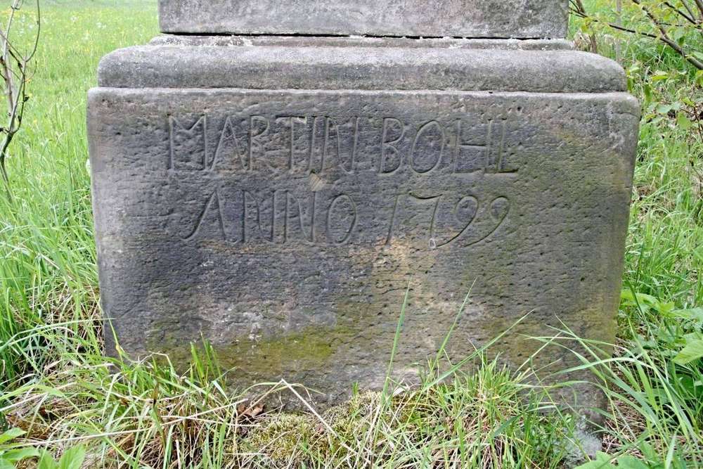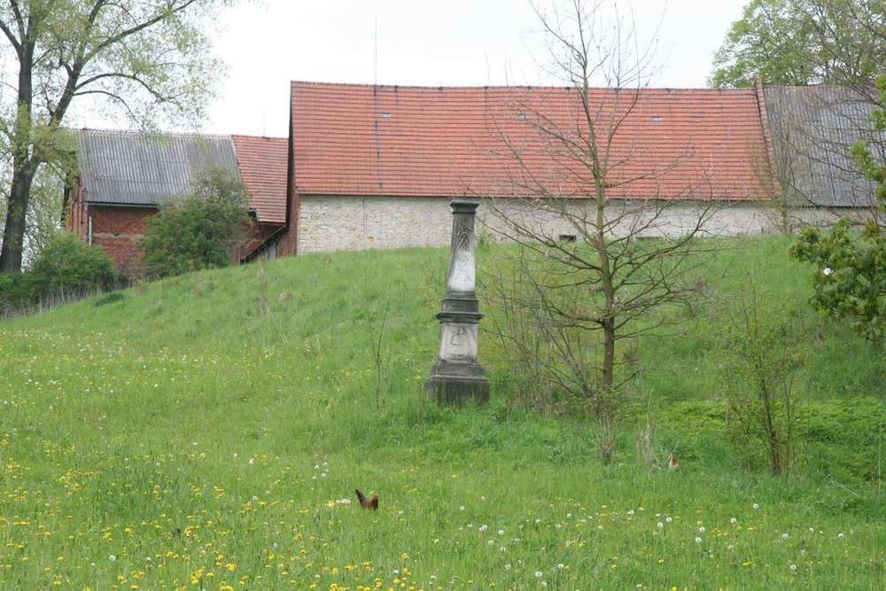 Krasíkov Torzo kříže v zahradě ve špatném stavu, reliefy skoro setřené