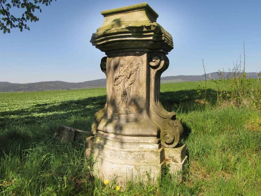 Bukovice Poničený, část kříže leží na zemi, vrcholový křížek chybí. Na podstavci vepředu letopočet 1773.