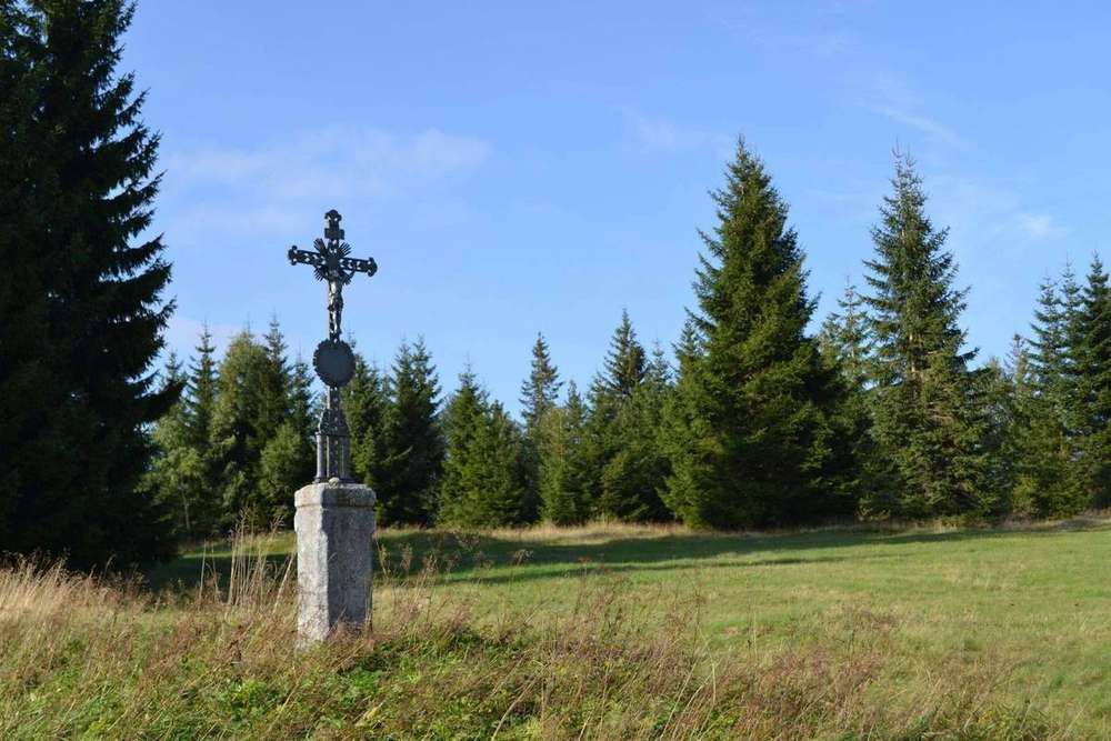 Horská Kvilda Kříž při bývalé cestě v zaniklé obci Zhůří u Rejštejna opravený po roce 1989.