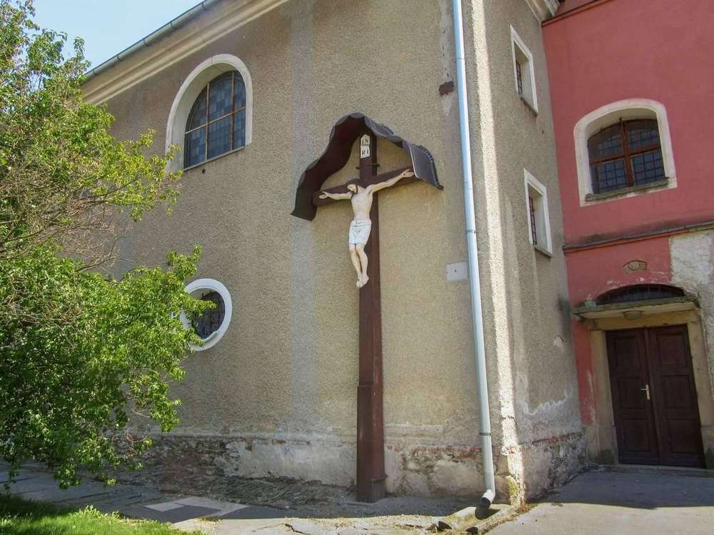 Hnojice Dřevěný kříž s dřevěným korpusem Krista.