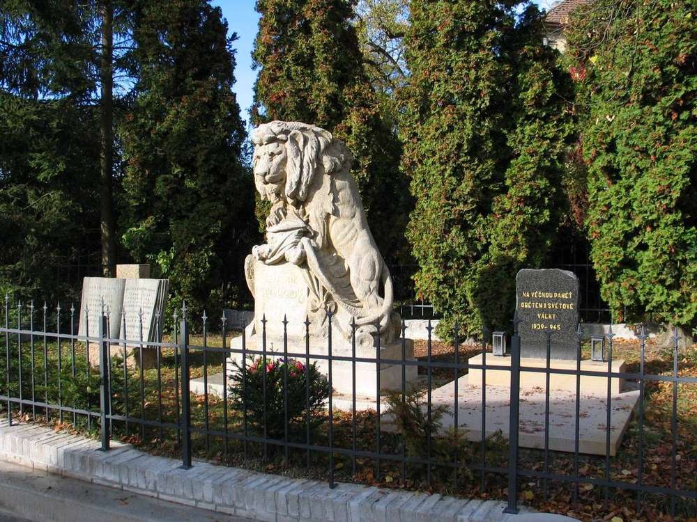 Kamenná kronika, umístěná vlevo od sochy lva, uvádí 8 padlých vojínů v 1. světové válce, seznam umučených v koncentračních táborech v letech 1939-1945, dva zahynulé v Německu v roce 1943 a dva padlé občany během květnové revoluce 1945.