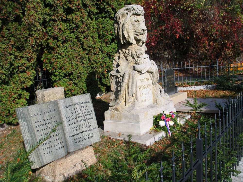 V roce 2017 nově restaurovaný pomník se nachází asi 30 m od chátrajícího statenického zámku, u křižovatky ulic Statenická a Pod zámkem. Jádrem pomníku (původně věnovaného padlým vojínům v 1. světové válce) je velmi originální sochařské dílo. Při bližším zkoumání návštěvník s překvapením zjistí, že se dívá na lva, který právě zakousnul rakousko-uherskou orlici. Zlacený nápis "Pomník svobody" tento dojem z vizuálního zážitku jen potvrzuje. Vlevo od sochy českého lva je dále umístěna kamenná kronika, která uvádí 8 padlých spoluobčanů v 1. světové válce, seznam umučených v koncentračních táborech v letech 1939-45, 2 zahynulé v Německu v roce 1943 a 2 padlé během květnové revoluce 1945.