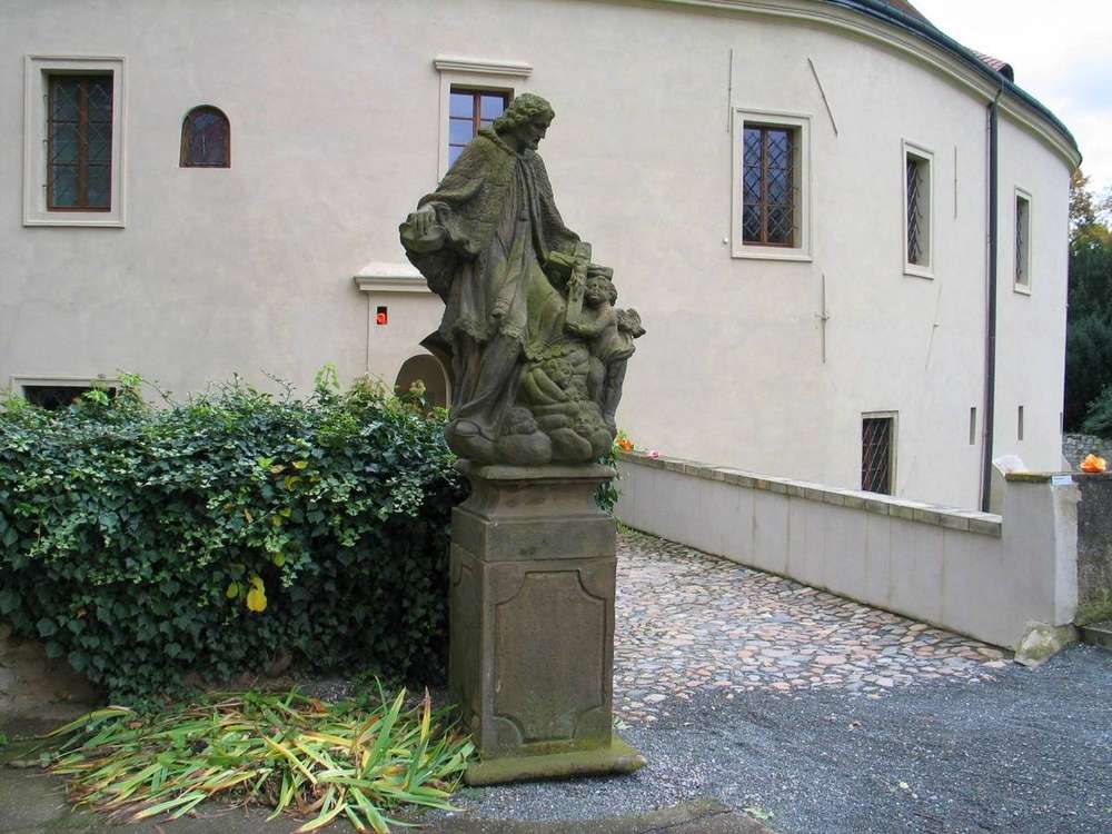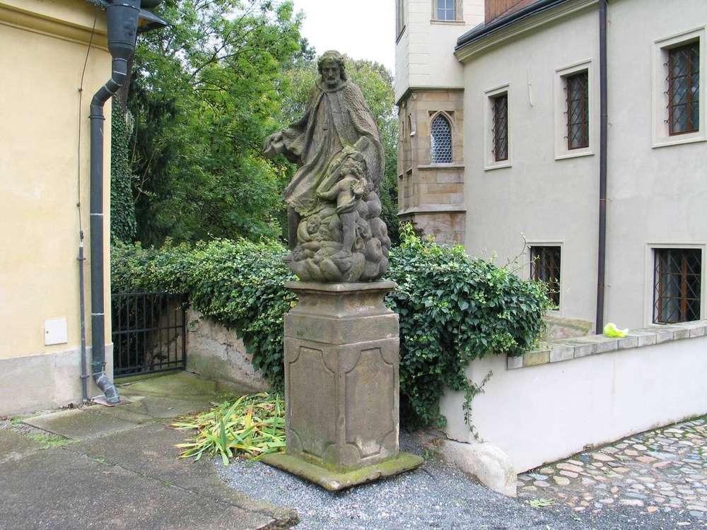 Pískovcová barokní socha s podstavcem, umístěná po levé straně nájezdu na mostek nad (dočasně) vyschlým zámeckým příkopem. Každý poutník, případně cykloturista, který do Roztok přijel po "modré" trase od západu, má ale zcela oprávněný pocit dejavu ... kde jsem to už viděl. Ano, naprosto totožná, nová replika této sochy byla umístěna ve Svatojánské uličce v nedalekých Statenicích ... v rámci akce přátelského soužití s Letištěm Praha.