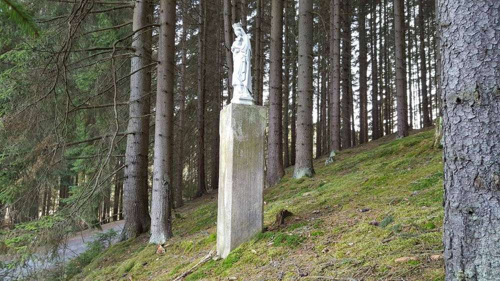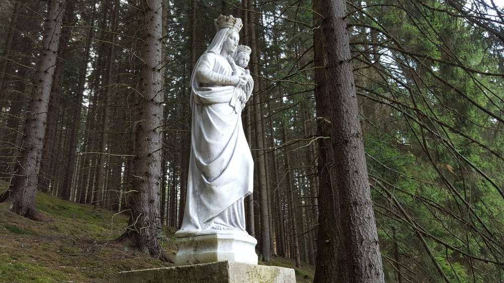 Branišov Socha Panny Marie na okraji lesa patřícího opatství Nový Dvůr. Na barokním pilíři, který byl nalezen při stavbě kláštera, je vyryt nápis: Opatství Matky Boží v Novém Dvoře MMXI.