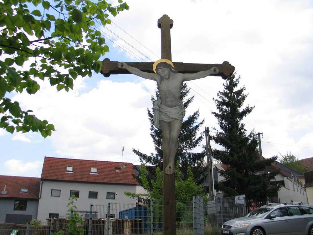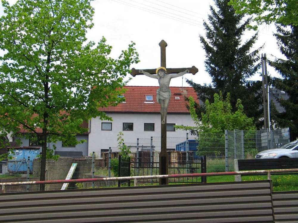Pamětní kříž s tělem Krista stojí na malém paloučku při vyústění ulice U Chundelů do Velvarské silnice. Byl vztyčen 28. července 2013 a slavnostně jej o pouti požehnal farář Marek František Míček z Nebušic. Repliku původního dřevěného kříže vyrobil pan Jakub Pávek z Roztok. Tělo Spasitele namalovala paní Lidmila Hrušková z Prahy na podklad vyrobený panem Lubošem Sadílkem.