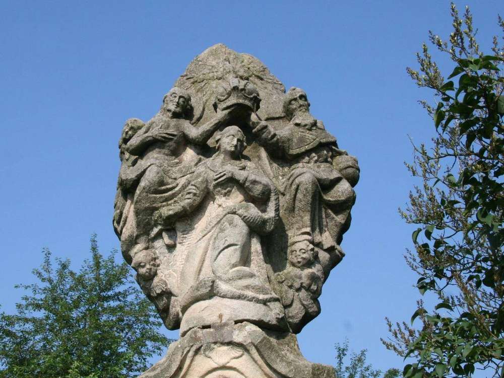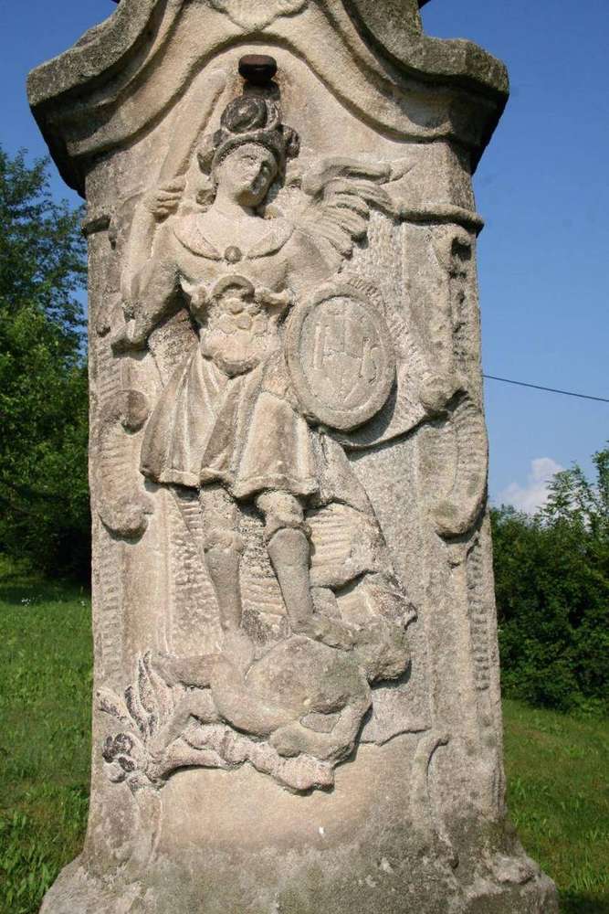 Hejtmánkovice Na čelní stěně pilíře výrazný reliéf archanděla Michaela stojícího v mírném kontrapostu na ďáblu ležícím v plamenech.