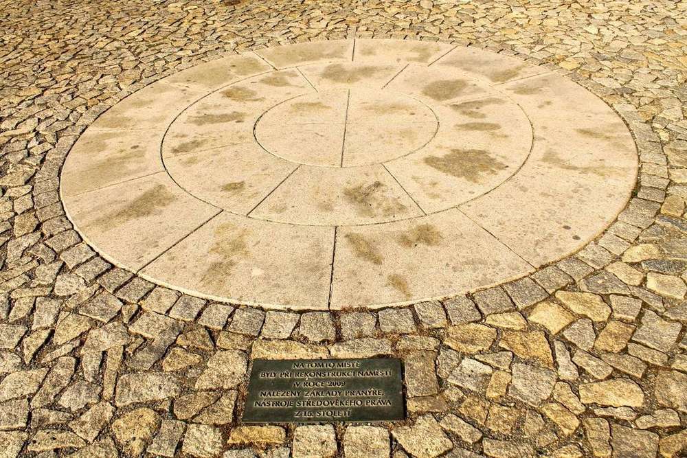 NA TOMTO MÍSTĚ BYLY PŘI REKONSTRUKCI NÁMĚSTÍ V ROCE 2009 NALEZENY ZÁKLADY PRANÝŘE, NÁSTROJE STŘEDOVĚKÉHO PRÁVA Z 15.STOLETÍ.