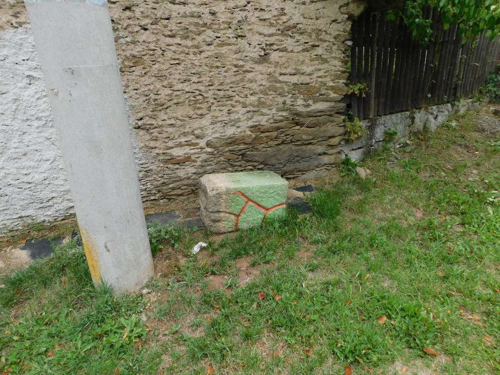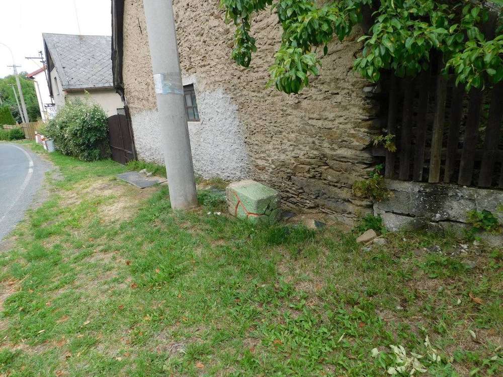 Brložec Fragment kříže, povalený kamenný podstavec, leží naproti kostela v Brložci, mezi domy čp. 6 a čp. 7.