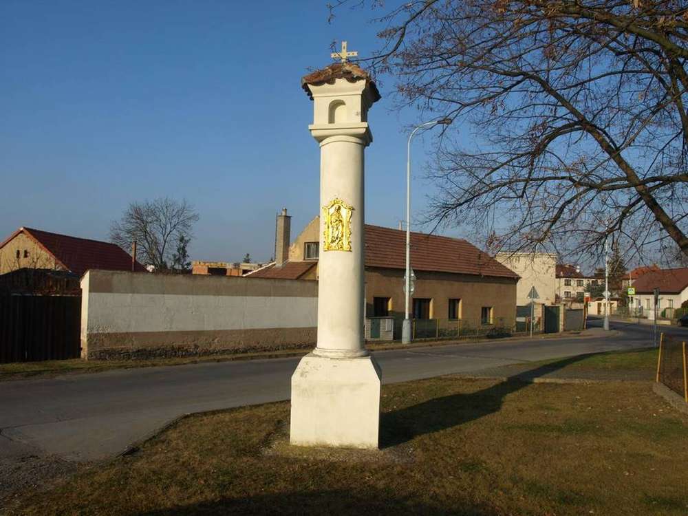 Praha - Písnice Masivní boží muka, pravděpodobně z 18. století, s kovovým reliéfem Panny Marie z roku 1883. Boží muka byla rekonstruována v roce 2006.