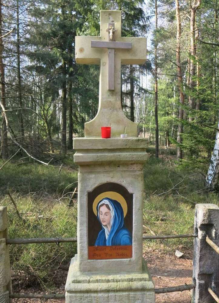 Ostrov u Tisé Kříž je v lese asi 100m JZ od rozcestí, 50m od stezky.