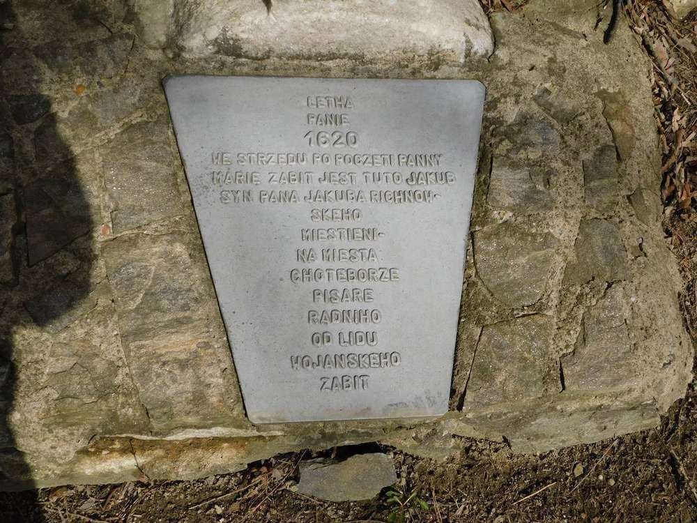 Křížek z roku 1620 stál původně v plotě u domu č. 50 v Nové Vsi, 200 kroků od železničního viaduktu. V roce 1911 byl opraven a zasazen do břehu na protější straně cesty. Kříž z bílého mramoru je 98 cm vysoký, vyrytý nápis na něm zní (je psán staročeštinou): Léta Páně 1620, ve středu po početí Panny Marie byl zabit tuto Jakub syn pana Jakuba Fichmanse měštětína města Chotěboře, písaře radního od lidu vojenského.