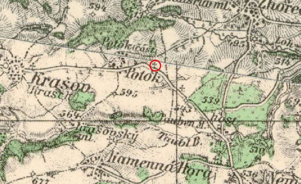 Potok U rozcestí silnice a cesty z Potoka do Zhořce, která byla v 1948-1948 rozorána.