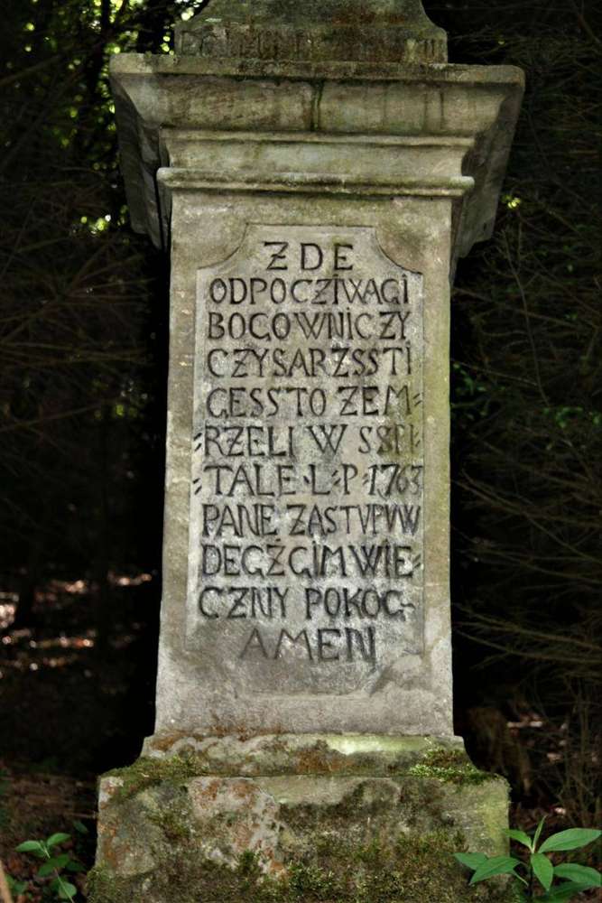 Rychnov nad Kněžnou Nápis na podstavci : Zde odpočívají Bojovníci Císařští, ješto zemřeli v špitále L.P. 1763. Pane Zástupův , dejš jim Věčný Pokoj, Amen.