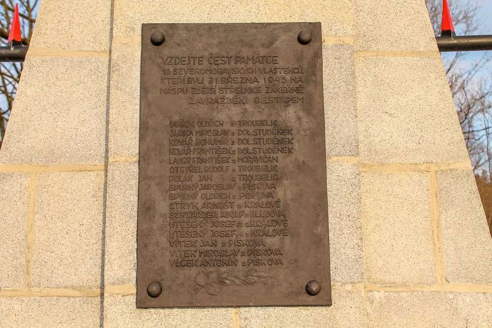 Šumperk Pomník 16 severomoravských vlastenců, kteří byli zavražděni v březnu 1945 gestapem na Bratrušovské střelnici. Nedaleko se nachází bývalý hromadný hrob, těchto obětí.
