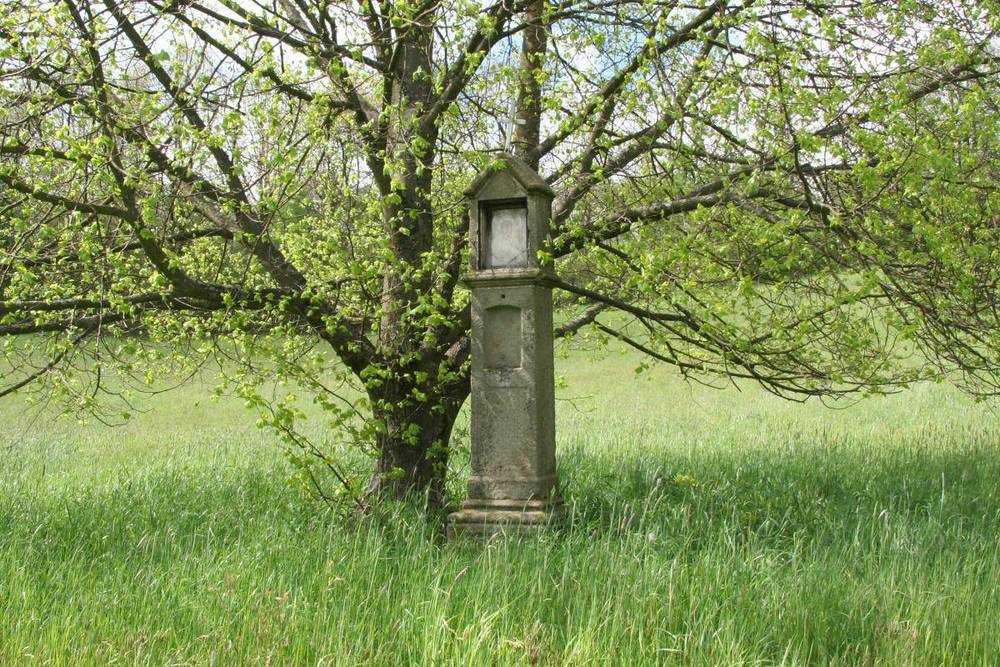 Hnátnice Boží muka stojí pod stromem uprostřed louky