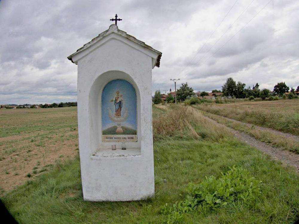 Pavlice Kaplička u polní cesty kousek od Pavlic s vyobrazením Panny Marie s Ježíšem na rukou, vznášející se na oblaku nad chrámem. Obsahuje nápis: "ZŮSTAŇ MATKOU LIDU SVÉMU"