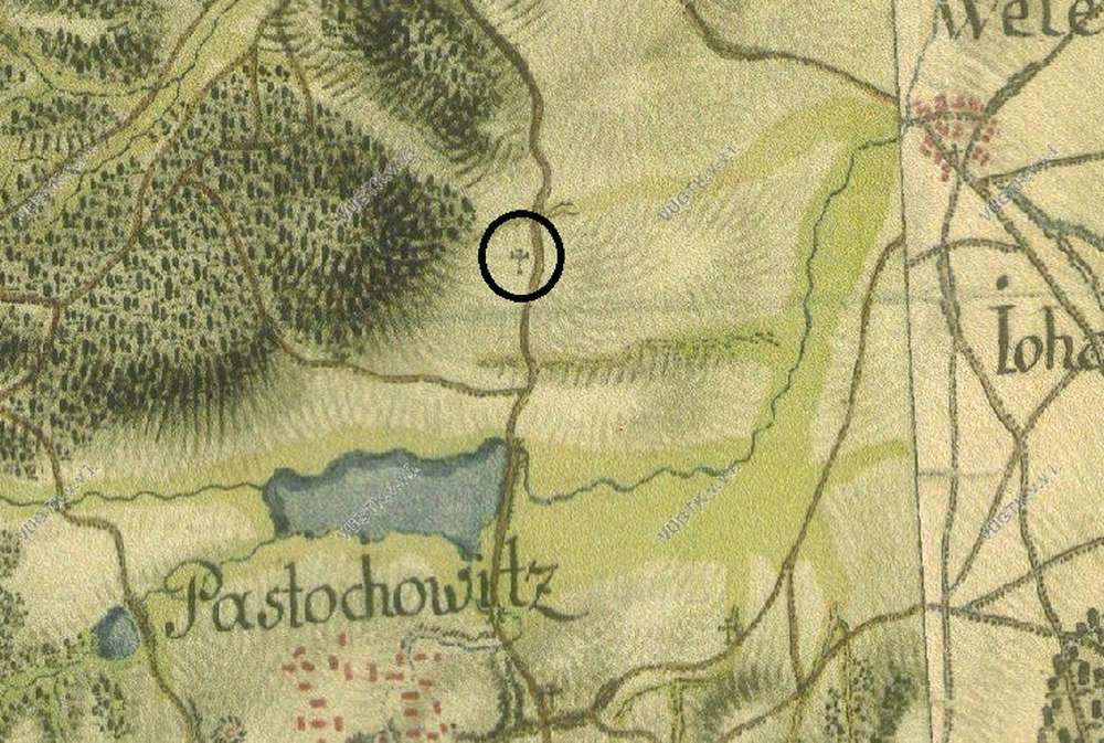 Pastuchovice orientační poloha na základě mapy z 18. století, později již zakreslována není