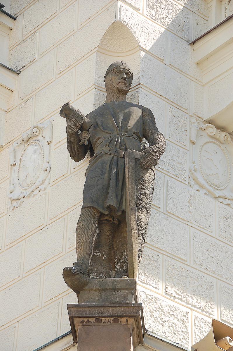 Náchod Podle návrhu Mikoláše Alše vytvořil sochař Čeněk Vosmík nárožní sochu zpodobňující rytíře Hrona z rodu Načeradiců, který někdy v polovině 13. stol. postavil nad starou zemskou cestou z Prahy do Polska hrad a zřejmě založil i město.