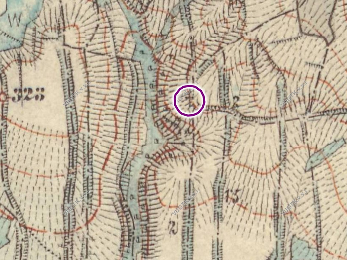 Našel jsem na ~ rok 1880 (III. voj. mapování) na rozcestí více na západ, pak na pozemkovém katastru, posunuta poloha.