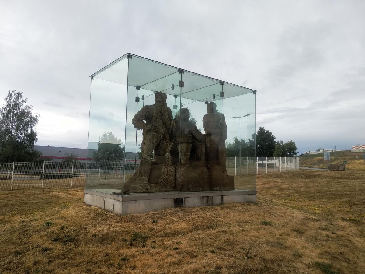 Rokycany Sousoší mužů, vyrobeno z povrchově upravené vlnité lepenky od francouzského výtvarníka J. Stolte. Sousoší je ve skleněném vzduchotěsném kvádru.
