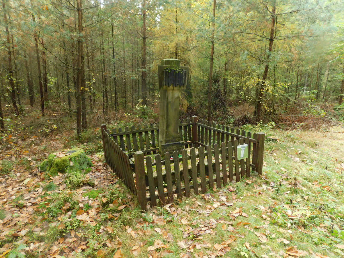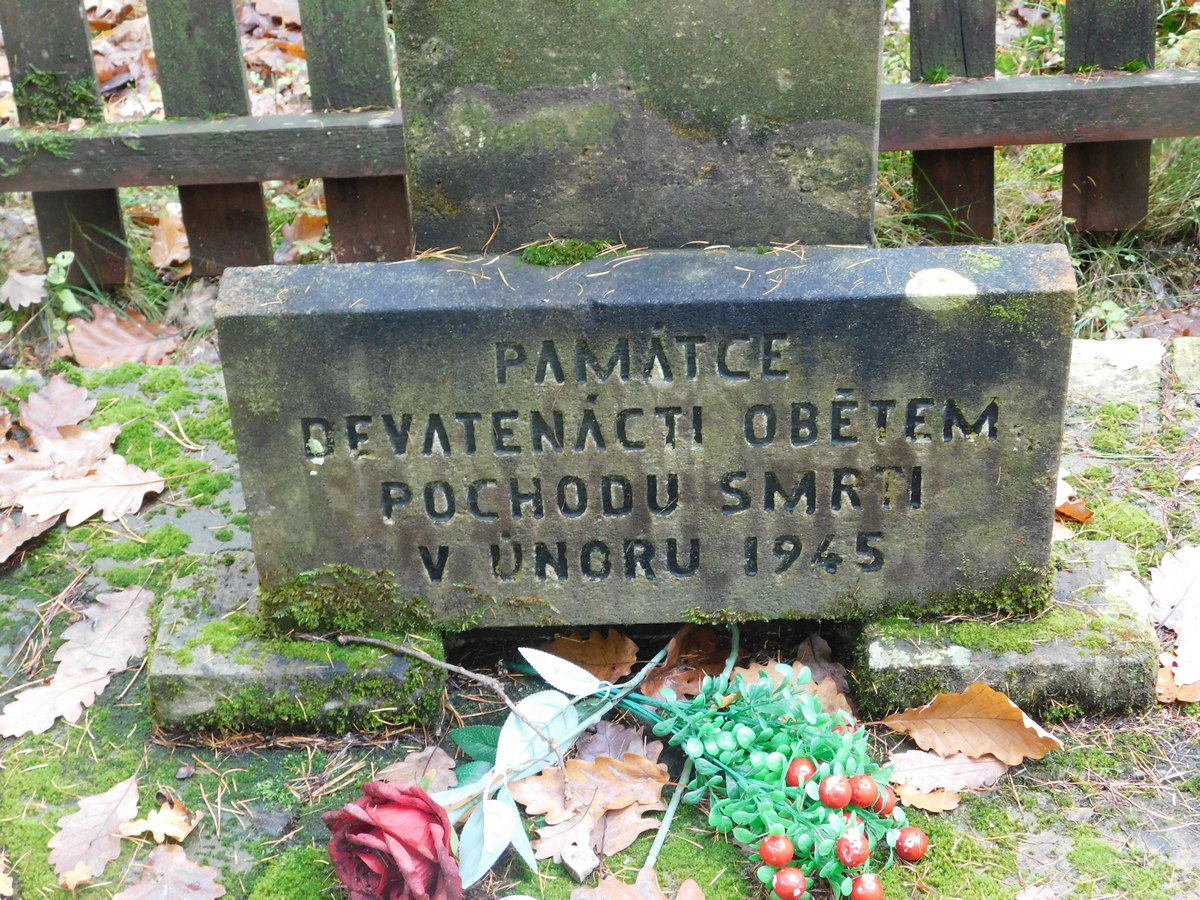 Pomník obětem fašismu se nachází u lesní cesty za lokalitou “U partyzána”. Pomník je obehnán dřevěným novodobým plůtkem o rozměru 210 x 225 cm. Na kamenné obdélné základně o rozměru 100 x 115 x 18 cm výšky. Na základně je vztyčen kvádrový pylon o výšce 185 cm, rozměru 28 cm x 30 cm, ve vrchní části s upevněnou horní obdélnou deskou s reliéfním abstraktním motivem (geometrické linie a vodorovnými výplněmi). V patě pylonu obdélná deska s textem versálek: PAMÁTCE / DEVATENÁCTI OBĚTEM / POCHODU SMRTI / V ÚNORU 1945 /. Materiálem pískovec, litý beton, kámen.