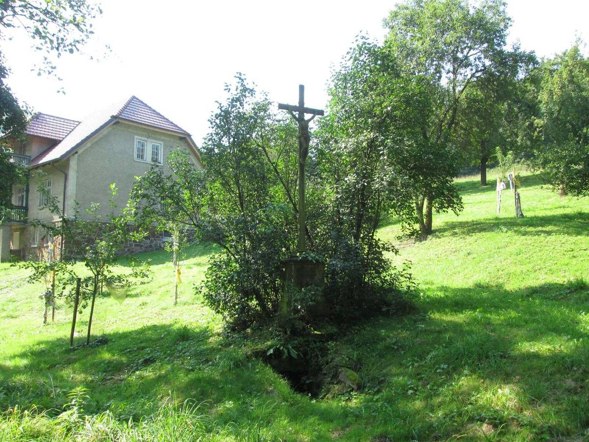 Kříž nad studánkou postaven na paměť mlynáře Václava Froňka r. 1866