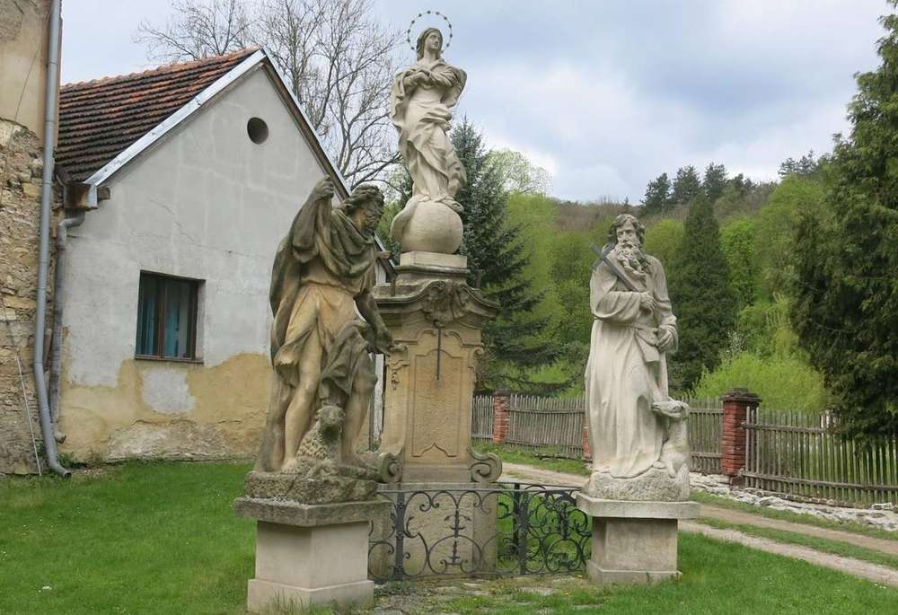 Svatý Jan pod Skalou Původní sousoší Panny Marie, sv. Ivana a sv. Jana Křtitele zde bylo postaveno v 18. století. Osud sousoší je spjat s jeho polohou u silnice. Sloužil jeden čas také jako lucerna a v roce 1937 do něj narazilo couvající nákladní auto. Řidič vozidla se částečně podílel na financování kopie poškozené sochy. Za necelých 30 let zase vandalové urazili hlavu sochy Panny Marie. Až v roce 2010 se sousoší dočkalo kompletní rekonstrukce.